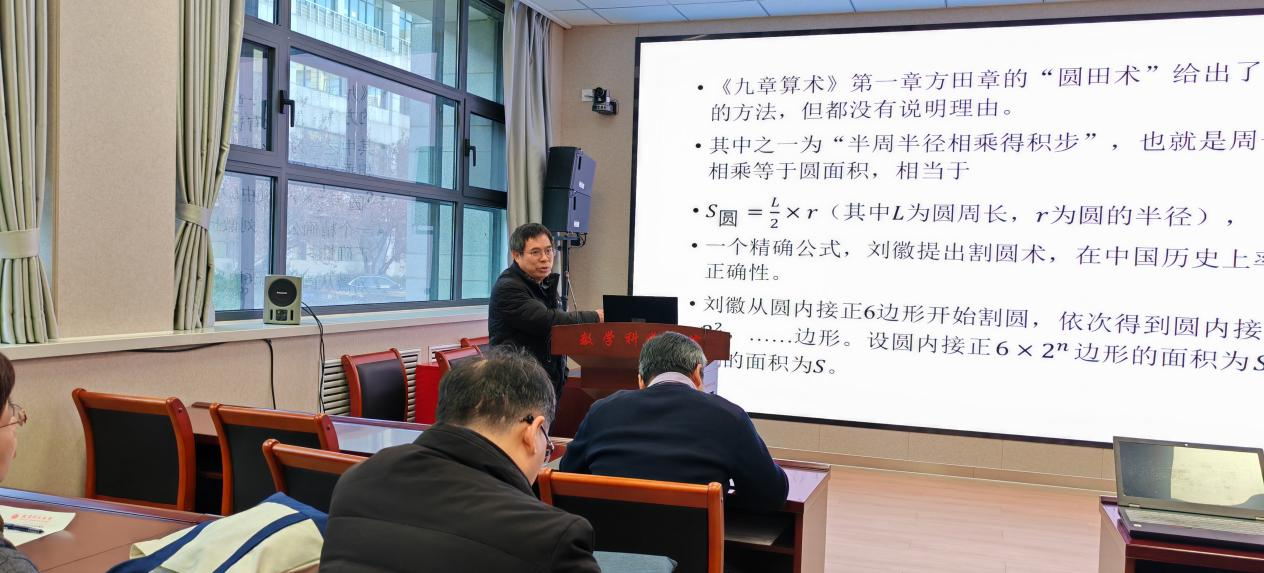 11月26日上午,我校研究生学术前沿讲座在博理楼B108举行。中国科学院自然科学史研究所博士生导师、国际科学史研究院通讯院士邹大海研究员以“数学大师刘徽的数学成就、思想方法和科学精神”为题作报告。科学技术史与文化遗产研究院、开云kaiyun官网、教育学部等师生代表60多人参加。科学技术史与文化遗产研究院院长郭龙建教授主持讲座。讲座前,郭龙健教授、开云kaiyun官网党委副书记、院长常慧宾与邹大海研究员就科技史学科建设展开深入交流。