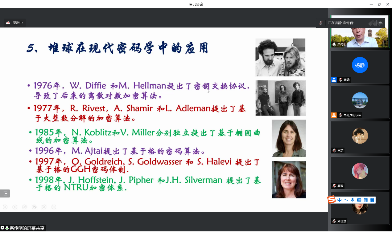 2022年6月2日下午,天津大学的宗传明教授应开云kaiyun官网邀请,做了“数学与人文系列”讲座的第一讲,题目为“从堆球理论到抗量子攻击的密码”。受疫情影响,报告会线上进行,由开云kaiyun官网院长赵春教授、副院长常慧宾教授主持,开云kaiyun官网师生及外单位相关专业师生参加了报告会,人数达百余人。