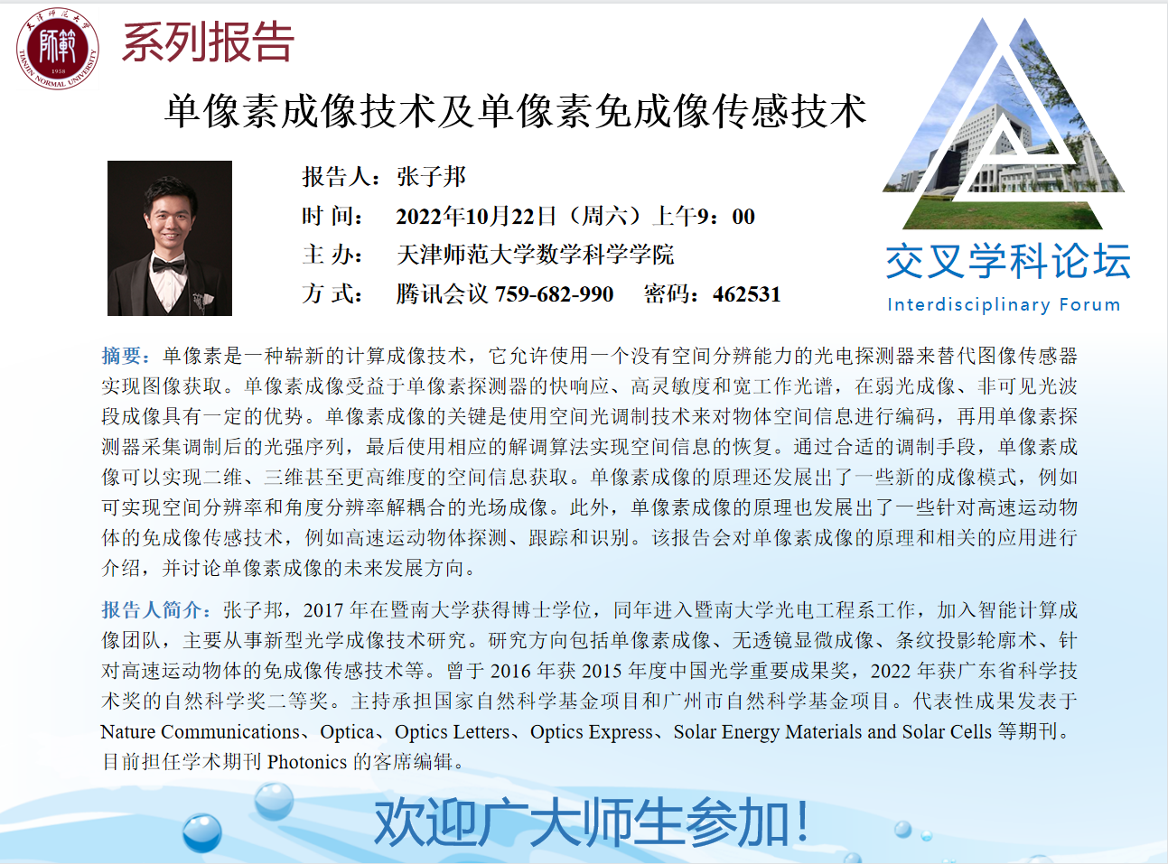 【预告】学术报告(2022-16)10月22日报告--单像素成像技术及单像素免成像传感技术