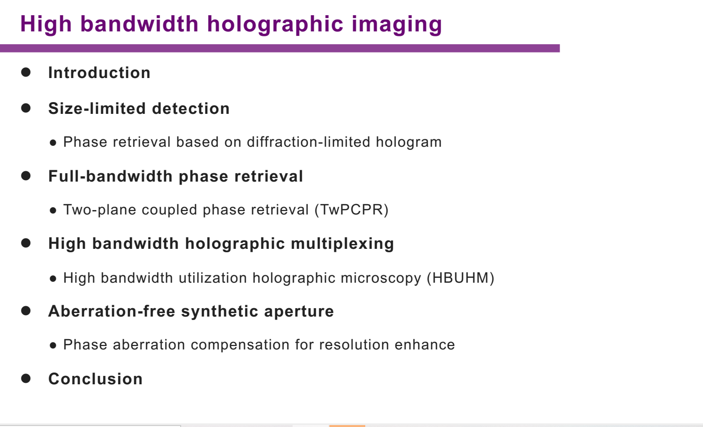 数字全息通过干涉成像方式,可以准确重构光波前的振幅和相位信息,具有快速、无损、三维成像等优势,在数字病理诊断、细胞无标记观察和实时监测等方面得到了广泛的研究和应用。在本次报告中曹教授介绍了实现高通量成像的主要方式,并分析数字全息的优势及空间带宽变化关系,展示了基于希尔伯特变换的面向高通量多通道复用数字全息技术的理论框架,并基于该理论设计了数字全息显微成像系统。报告最后,曹教授在线与师生进行了友好互动,对师生提出的问题进行解答。