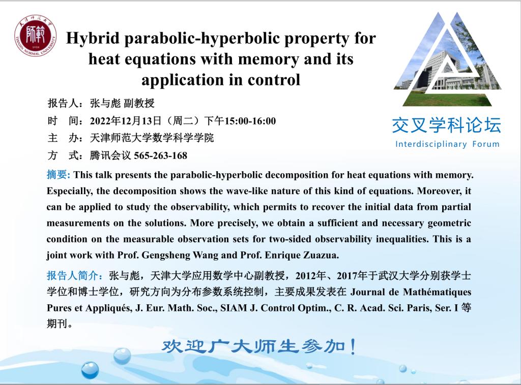 【预告】学术报告(2022-22)12月13日报告--Hybrid parabolic-hyperbolic property for heat equations with memory and its application in control
