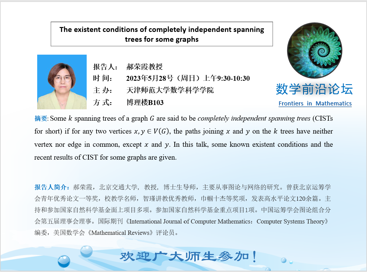 【预告】学术报告(2023-8)5月28日——The existent conditions of completely independent spanning trees for some graphs