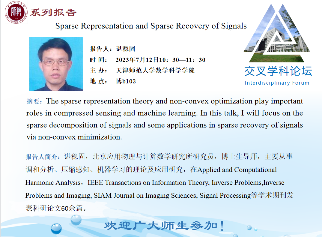 【预告】学术报告(2023-21)7月12日——Sparse Representation and Sparse Recovery of Signals