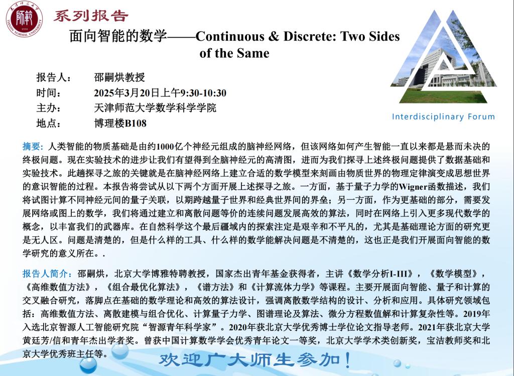 【预告】学术报告(2025-1)3月20日——面向智能的数学——Continuous &Discrete:Two Sidesof the Same